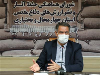 اقبال عباسي شامگاه سه‌شنبه در شوراي هماهنگي حفظ آثار و نشر ارزش‌هاي دفاع مقدس چهارمحال و بختياري تقويت آثار و فرهنگ دفاع مقدس را ضروري اعلام و تاکيد کرد: ساخت يادمان براي شهدا در دستور کار قرار گيرد.